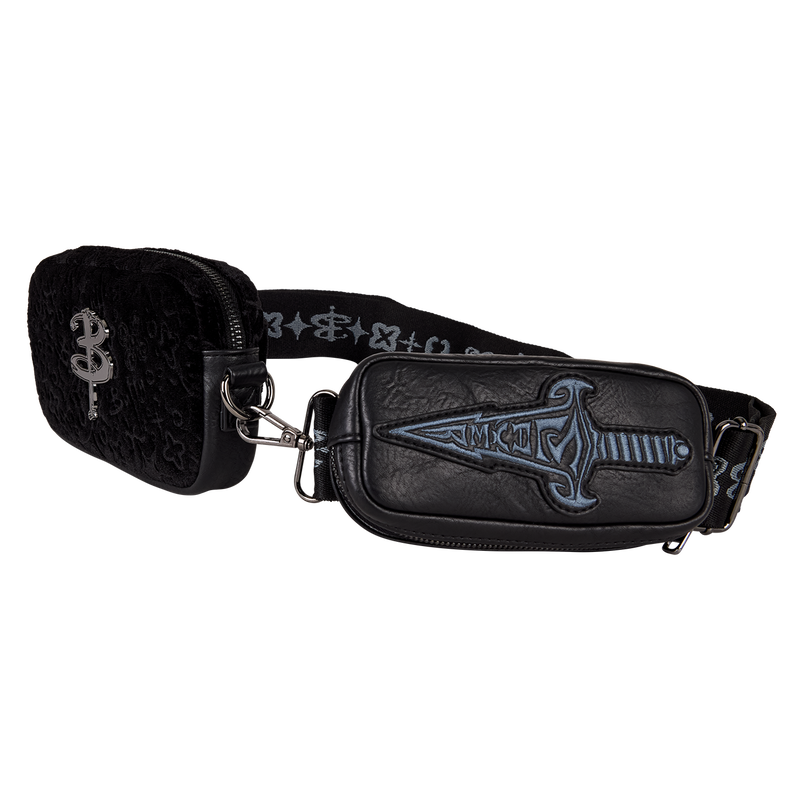 This sling bag is inspired by Buffy the Vampire Slayer. It’s made of black velvet with motifs from the show “burned out” of it. You’ll find distressed leather accents and a metal charm of a “B” in the Buffy font. Plus, there’s a coin bag attached to the strap that features Buffy’s dagger.
