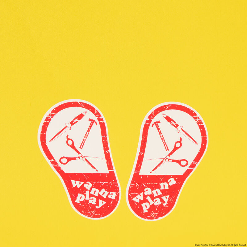 The Good Guy is ready to play up your look. Our Chucky Mini Backpack, shaped like a Good Guys Chucky doll box, is full of frighteningly fun details. On the front, embroidered letters in red spell out “Chucky,” and the text below reads, “He wants YOU for a best friend.” It also appears that he’s ready to come out of the box, as his applique form “slashes” an applique knife through the clear PVC packaging material. The box also includes pictures of the Good Guys accessories and a message to collect them all. An age range and “warning” sign add realistic details. Chucky’s sweeter side plays out on the side pockets. Charming prints show him in action as a builder, firefighter, baseball player, and doctor. On the back, prints of shoe-shaped feet, with the words “wanna play”—and various “toys”—appear. Pack your daily essentials for a memorable play date or adventure in style.