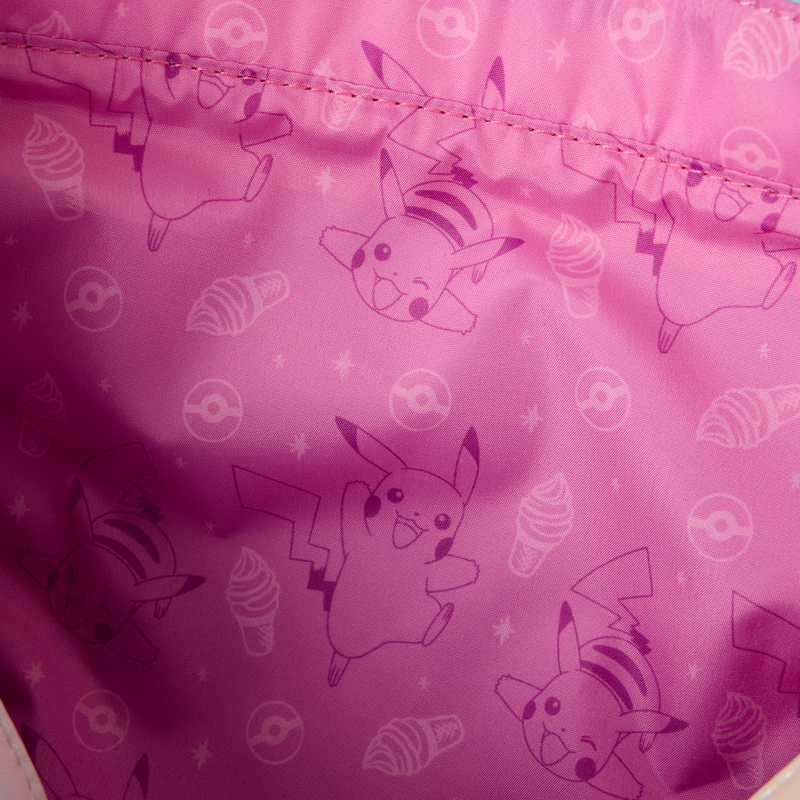 This tote bag features Pikachu embroidered front and center. All around and on the straps, you’ll find designs of hearts, Poké Balls, and sweet treats! Attached to the crossbody strap is a coin bag that looks like a Poké Ball.